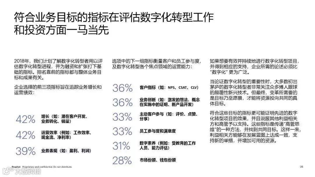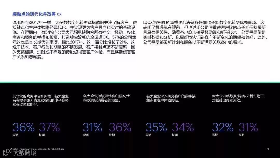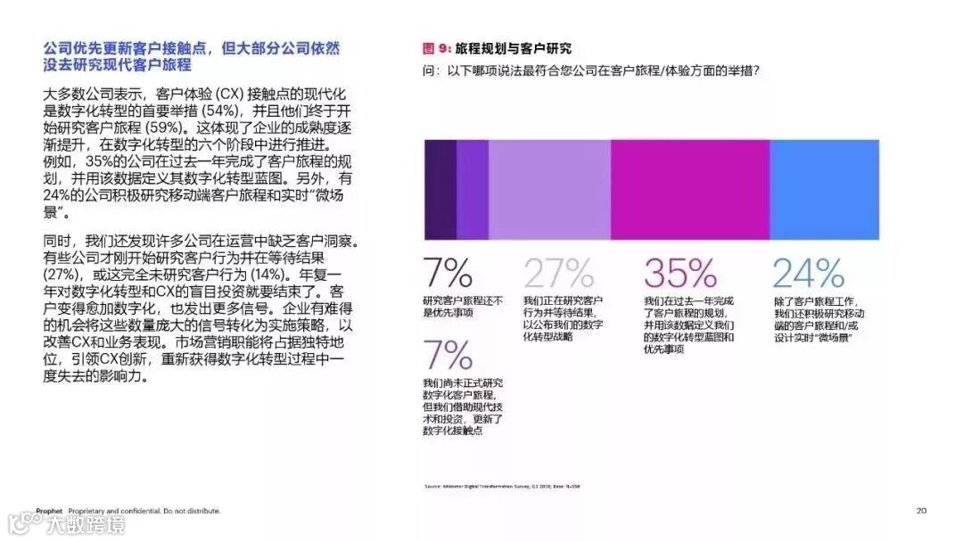 尽管大家逐渐意识到人为因素在数字化转型进程中所发挥的重要作用,例如:员工体验和企业文化,大多数转型举措仍继续着眼于客户接触点的现代化 (54%) 和基础设施的加强 (45%)。但许多企业却没有通过尽职调研以理解他们的客户,有 41% 的企业在没有进行全面客户调研的情况下,便对数字化转型作了投资。