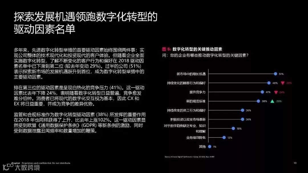 市场压力是促进数字化转型的主要因素,大多数举措受成长机会 (51%) 和白热化的竞争压力 (41%) 推动。每每登上头条的数据泄露丑闻及GDPR 等新监管标准也促进着企业转型 (38%)。
