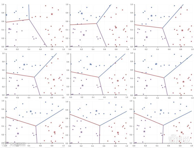 上图是以随机生成的数据点为例,k=3的K-means算法的迭代过程,其中五角星为聚类中心,点的颜色是其类别。在实际应用中,为了获得一个比较好的特征空间,使得“数据之间的相似性与他们在特征空间上的距离有关,距离越近越相似”这句话尽可能成立,我们往往会构建模型来把原数据变换到这么一个特征空间,然后使用K-means算法来进行分类。
