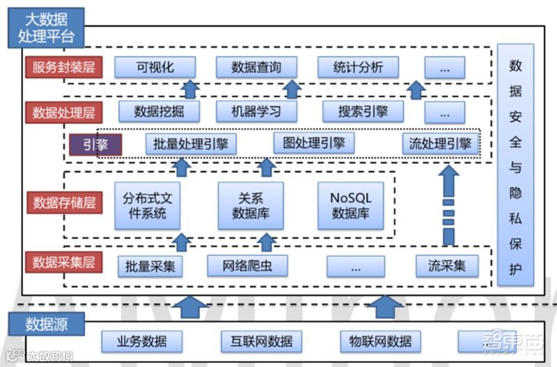 除此之外,大数据处理平台一般还包括数据安全和隐式保护模块,这一模块贯穿大数据处理平台的各个层次。