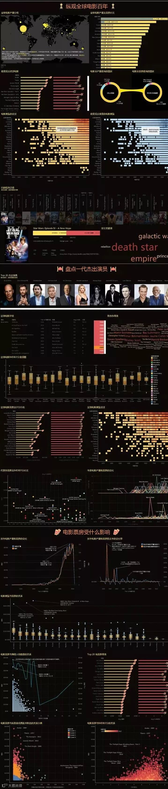 该作品从人文科学角度分析了近一百年的 IMDB 电影数据,讲解了全球电影的发展史。作品分为三个部分。首先总览全球电影百年,对比国与国之间的电影产量和票房,阐述了电影的普及和电影类型的变迁。其次盘点一代杰出演员,分析优秀演员的特征及其 “星” 路历程。最后剖析了高票房电影的成功因素,总结了创造高票房电影的秘诀。