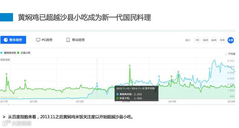 从图中可以看到,2013.11之后黄焖鸡米饭关注度以开始超越沙县小吃,此后关注度一路飙升。