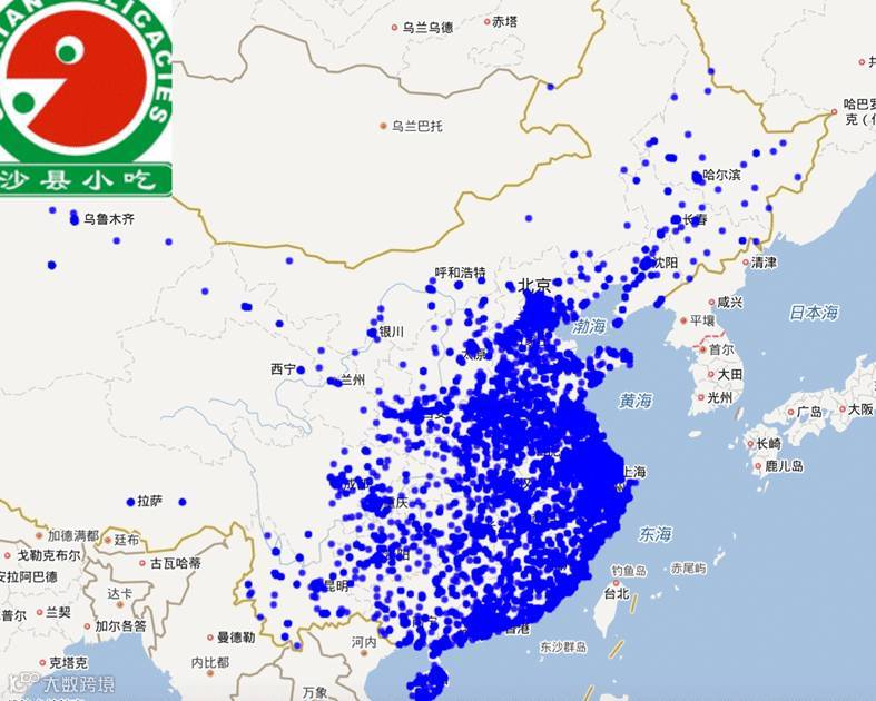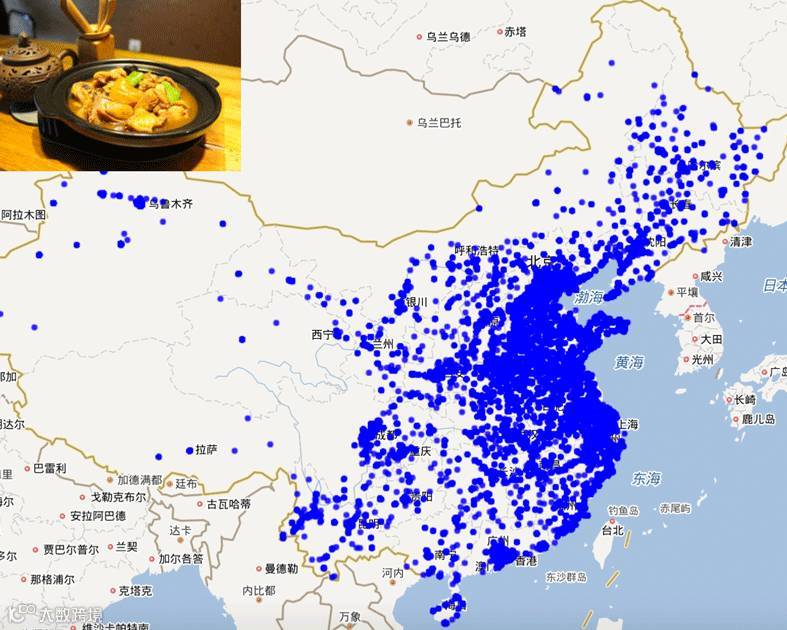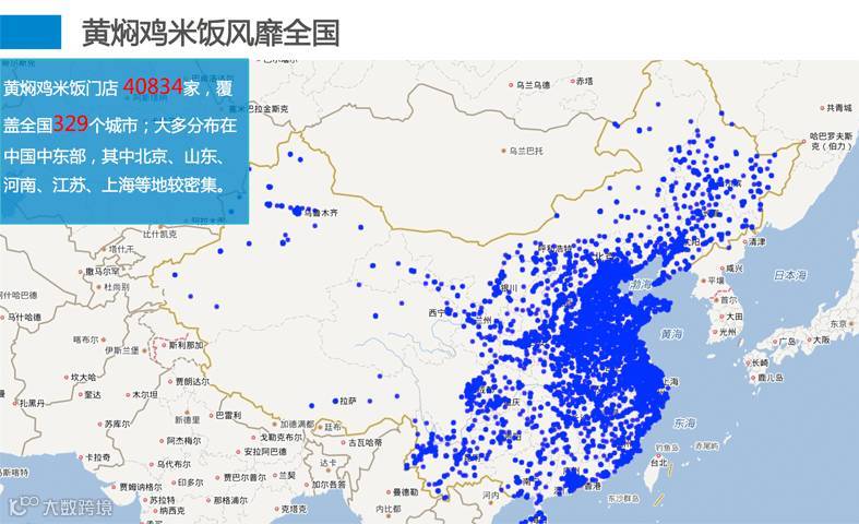 黄焖鸡米饭门店 40834家,覆盖全国329个城市;大多分布在中国中东部,其中北京、山东、河南、江苏、上海等最为密集。