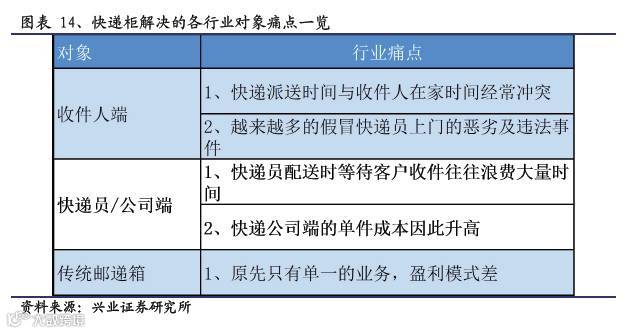 另外,从业务角度来看,我们认为,电商、快递系的快递柜企业,由于天生的上游或下游巨大业务量优势,将会在流量端占据优势,未来社区O2O业务将较第三方企业更容易上手和对接。