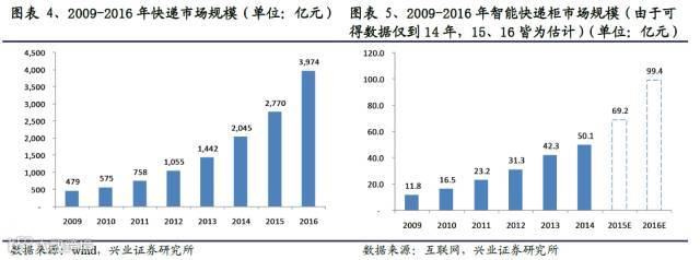 据统计,我国2014年智能快递柜的行业规模达到50.10亿元,并且根据2009-2014年数据,估计2016年市场约近百亿规模,而2017将大概率超过100亿。