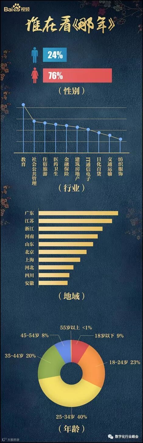 从百度视频大数据分析结果来看,女性观众是绝对主力,18~34岁的用户占比超6成。而从用户行业来看,教师、公务员、旅游行业从业人员是追此剧的主要群体。