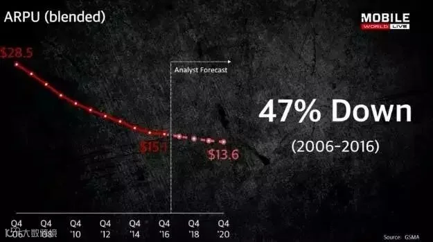 过去10年,运营商的ARPU下降了47%,不过据分析预测,未来几年还将继续下降。