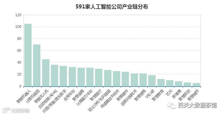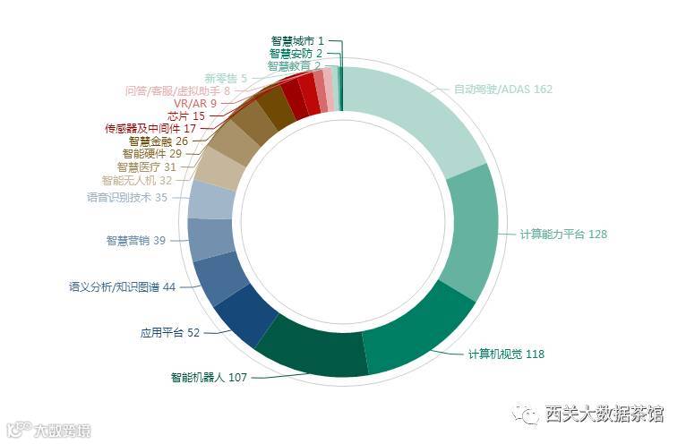 本文对爬取自IT桔子的1158家AI初创公司数据进行清洗、筛选及转换后,对最终剩下的591家公司根据上述的AI产业链分类标准,进行了领域分类。不得不说在复现这项关键统计的过程中,需要花费了不少精力去对每家公司的业务进行观察判断,但整个过程结束后,会对整体国内AI产业现状产生更深刻的理解,最终统计结果如下图所示。目前智能机器人是AI产业中最为热门的领域,初创公司数量达到了105家,随后是通用计算机视觉技术(70家),包括了各类人脸识别、图像处理以及视频监控等技术领域细类。与智能机器人类似,目前国内有45家初创公司扎堆在智能无人机的创业大潮中,而在自动驾驶/ADAS方面,目前有超过30家公司进入了这一领域,而目前百度已经逐步开放其Apollo自动驾驶平台(目前已开放到1.5版本),类似平台的开放将大大降低初创公司在自动驾驶方面的研发难度,预期以后或许有更多的初创团队进入自动驾驶的风口上。