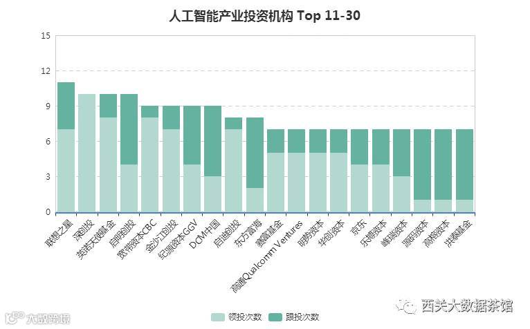 在其余前30位的AI产业投资方,我们了联想、高通和京东的身影,All in人工智能的联想在AI产业创投中不乏大动作,相继投了寒武纪、Face++、蔚来汽车、水滴科技等AI公司,旗下联想之星累计在AI领域投资了11轮。京东的AI产业投资组合也非常聚焦,除了ChinaScope数库这家金融大数据公司外,其余均是智能汽车/智能硬件相关。包括蔚来汽车、智行者科技及乐驾科技3家智能汽车/ADAS公司,以及智造未来机器人等硬件领域公司。另外,与Top 10机构不同的是,在Top 30榜单中其余机构中跟投的比例非常高,与Top 10机构形成了鲜明的对比。
