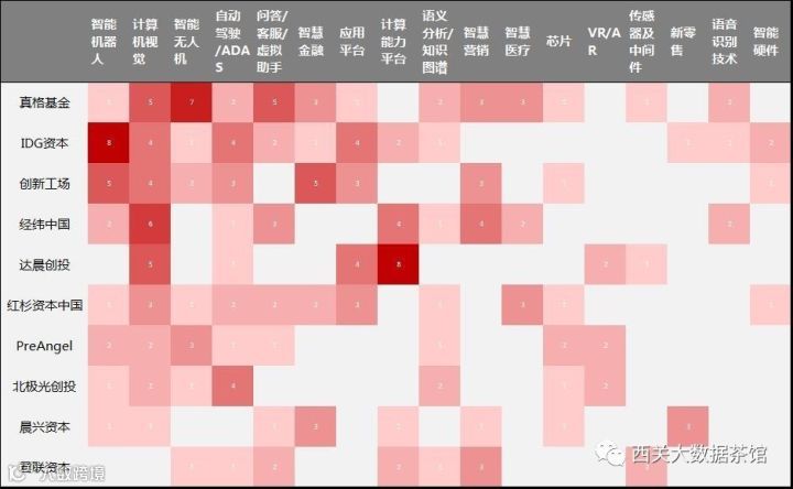 本节,我们来看看上述人工智能产业投资Top 10榜单中的十家机构,在整体AI产业链的布局情况。为了便于展示,本文选择包括智能机器人、计算机视觉、智能无人机、自动驾驶/ADAS、问答/客服/虚拟助手、应用平台、智慧金融、计算能力平台、语言分析/知识图谱、语音识别技术以及智慧医疗等上述10家机构中任一家实现了布局的17个领域,制作了以下可视化图表去展示这十家机构的AI产业链布局。