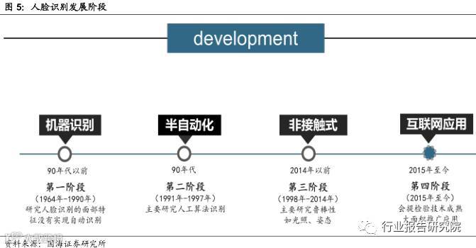 人脸识别最初在20世纪60年代已经有研究人员开始研究,真正进入初级的应用阶段是在90年代后期,发展至今其技术成熟度已经达到较高的程度。整个发展过程可以分为机械识别、半自动化识别、非接触式识别、及互联网应用阶段。