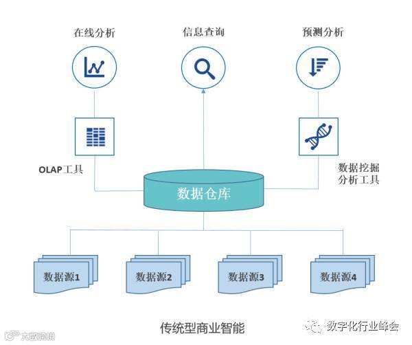 从技术上来讲,传统的商业智能就是从不同的数据源中收集有用的数据,对数据进行清理,以保证数据的一致性和准确性;然后将数据进行相应的转换,再加载到数据仓库中;最后选择合适的数据挖掘分析工具和OLAP工具,将数据转化为报表、Dashboard等可视化形式的信息,SAP BO \ IBM Cognos都是这样的方案。