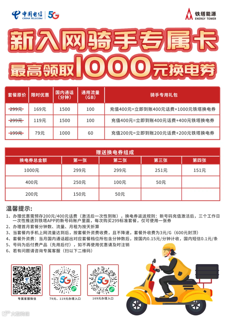 ● 充值400元赠送:400元话费+1000元铁塔换电券(299元换电券*2张,251元换电券*1张,151元换电券*1张)