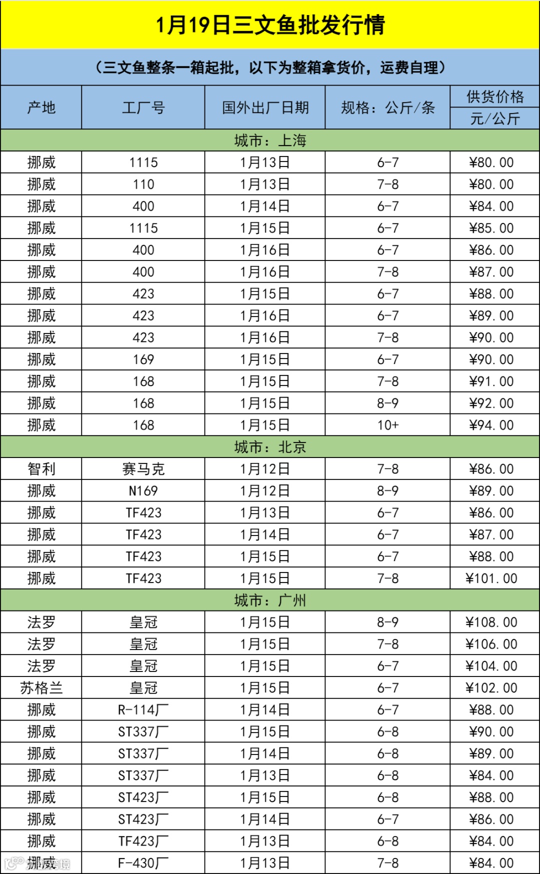 1月19日三文鱼批发行情(上海|北京|广州)