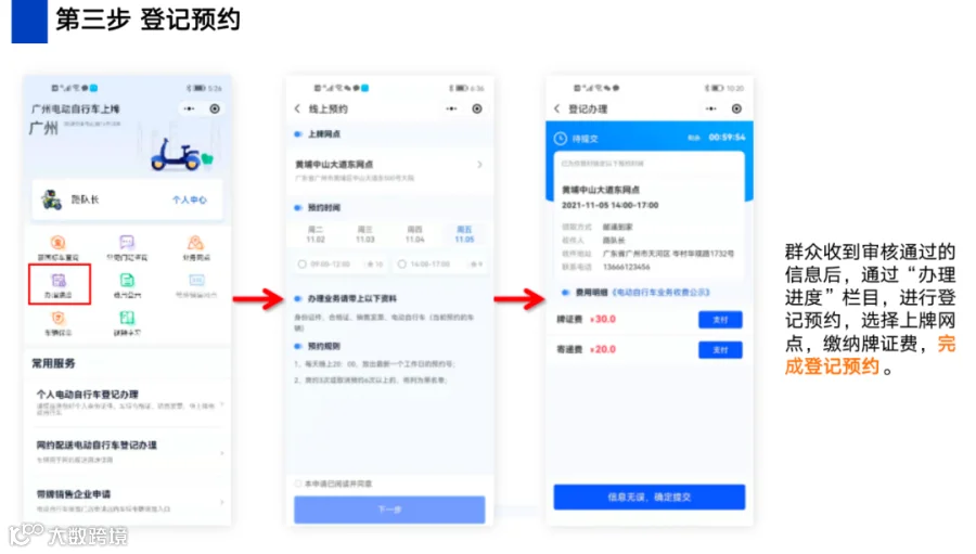 1、警邮网点登记上牌。骑手可通过“广州交警”微信公众号提交申请和预约登记。