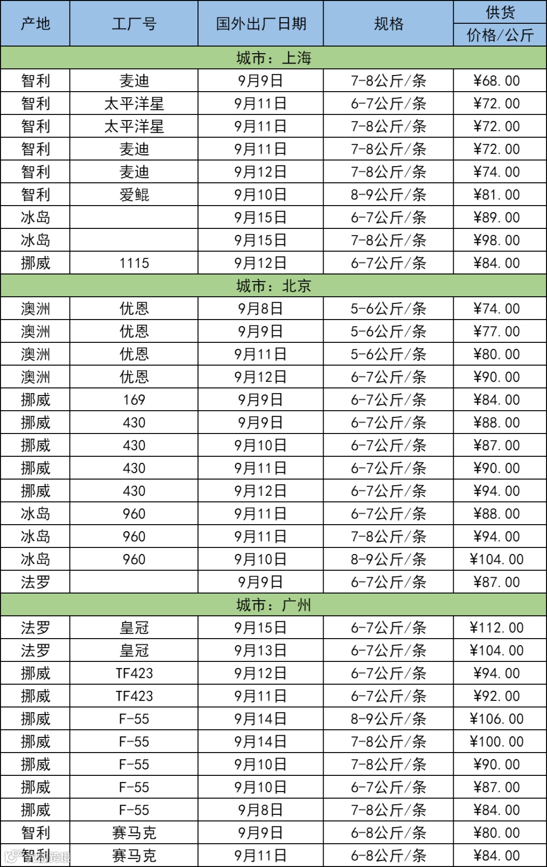 9月18日三文鱼批发行情(上海|北京|广州)