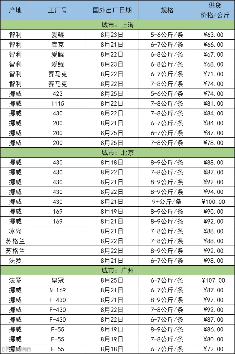 8月28日三文鱼批发行情(上海|北京|广州)
