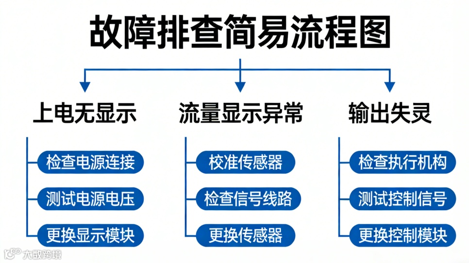 流体温 / 粘度 / 压力超范围(0-90℃、≤3mPa・s、0-1MPa);非 25℃基准调试;脉冲换算 / 显示单位设置错误;管道空管 / 泄漏。