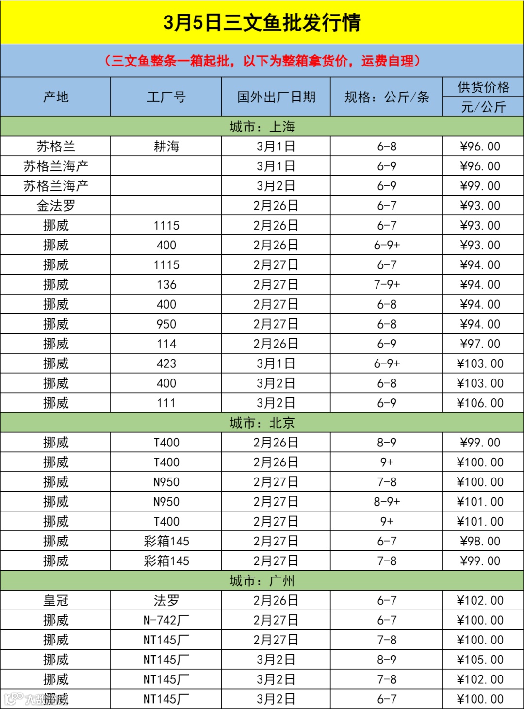 【3.5三文鱼批发行情】受中东航班中断影响,第10周三文鱼批发价持续上涨