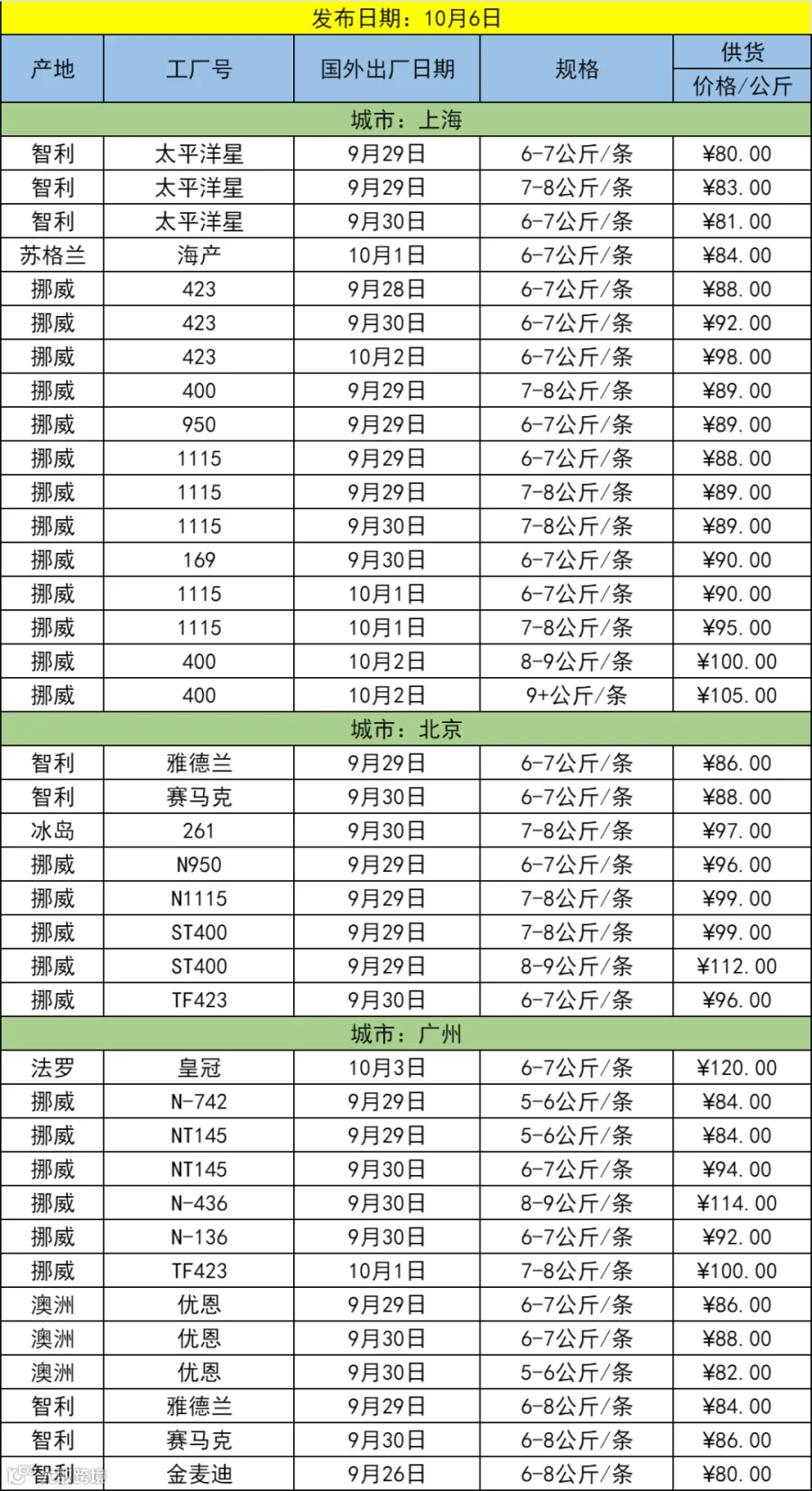 10月6日三文鱼批发行情(上海|北京|广州)