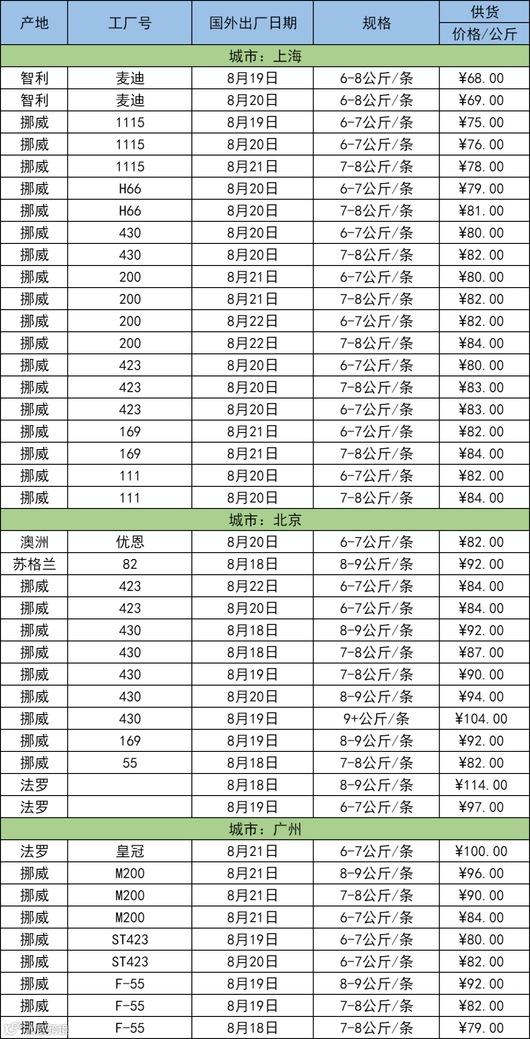 8月25日三文鱼批发行情(上海|北京|广州)