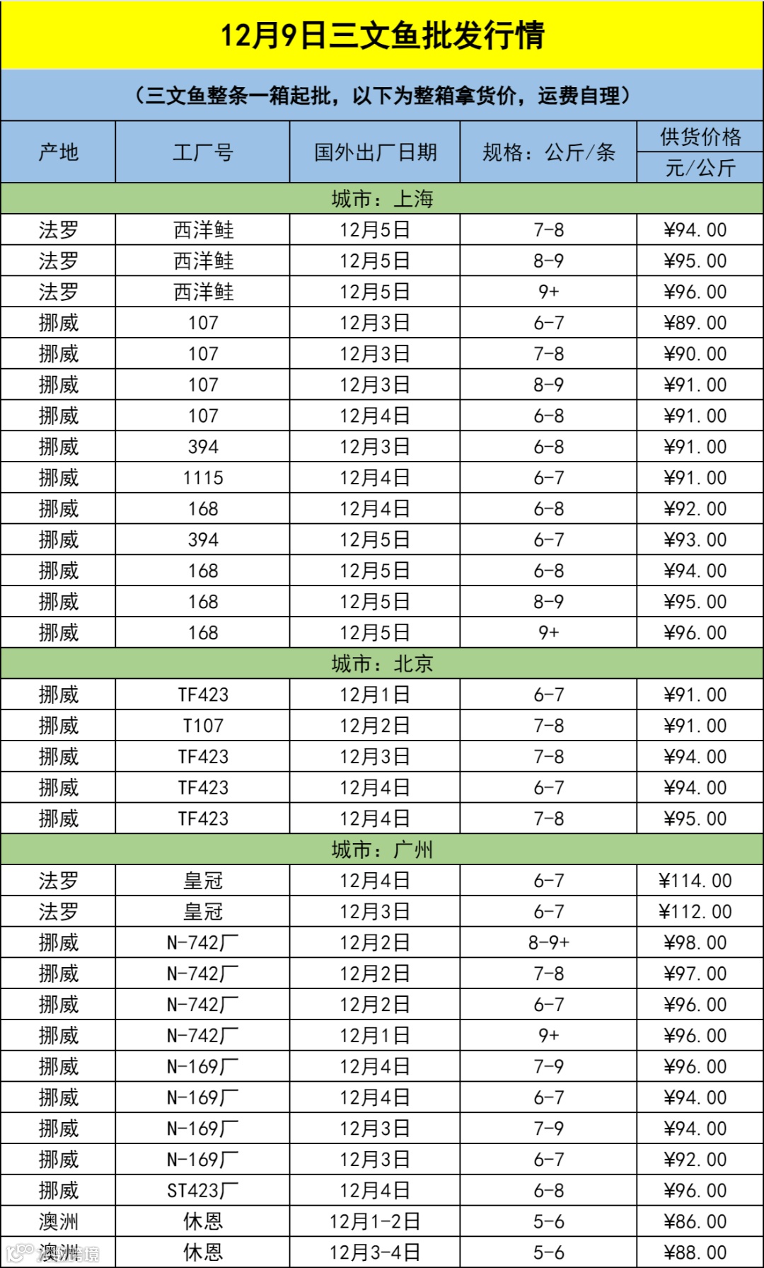 12月9日三文鱼批发行情(上海|北京|广州)
