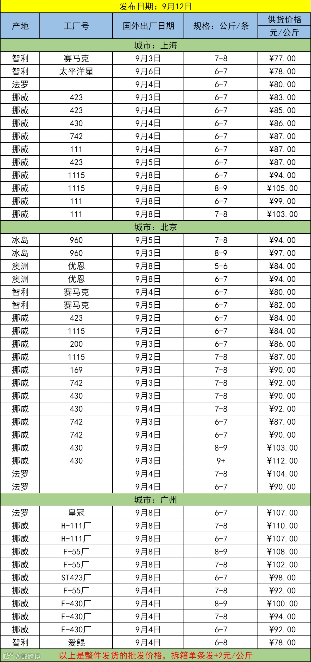 9月12日三文鱼批发行情(上海|北京|广州)