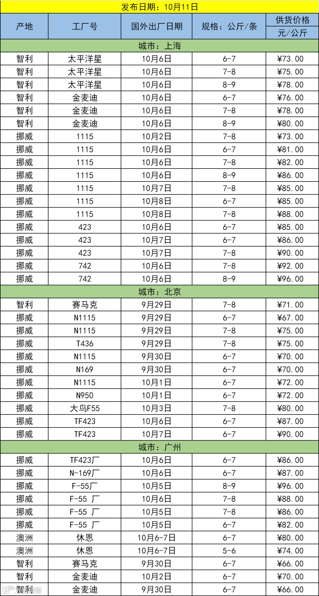 10月11日三文鱼批发行情(上海|北京|广州)