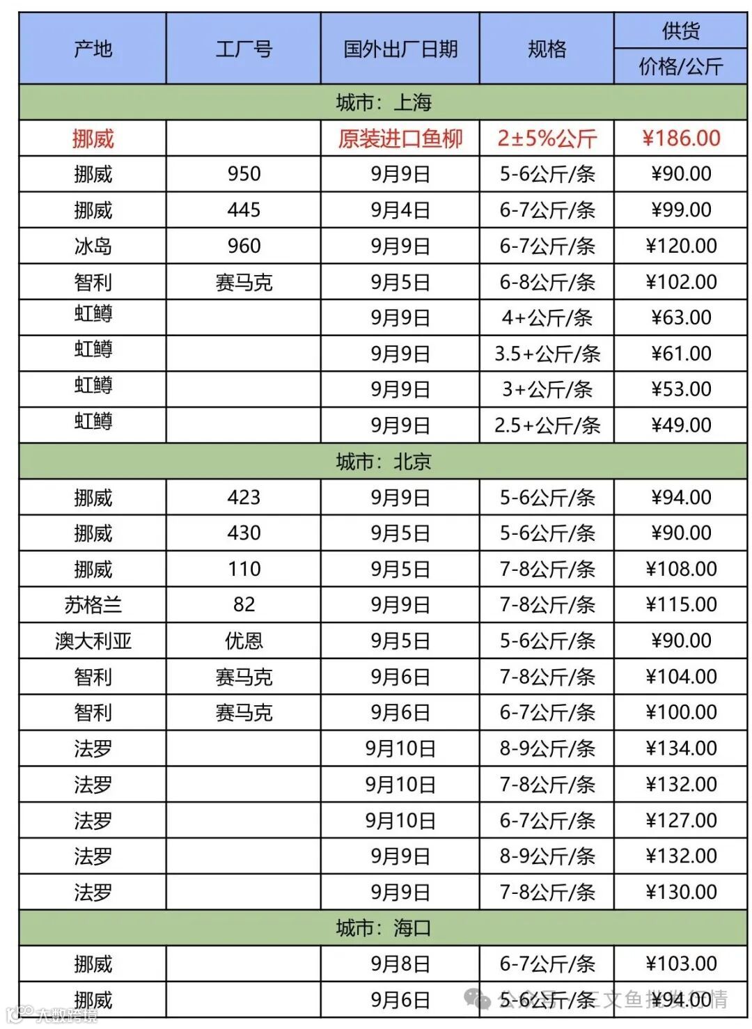 9月13日三文鱼批发行情(上海|北京|海口)