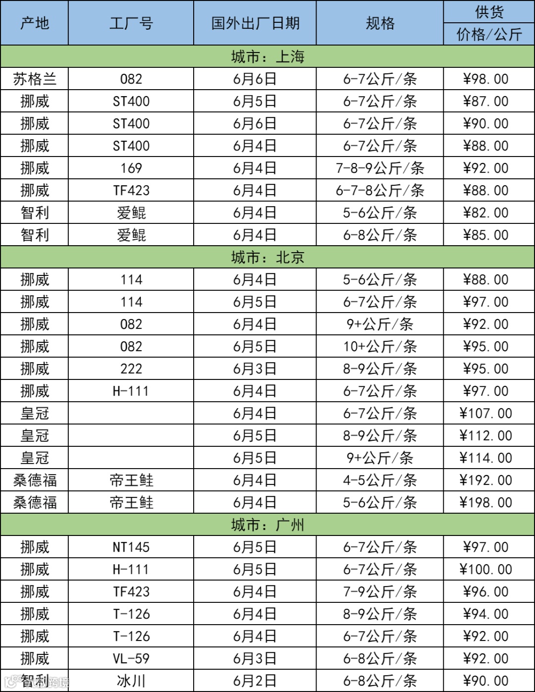 6月9日三文鱼批发行情(上海|北京|广州)