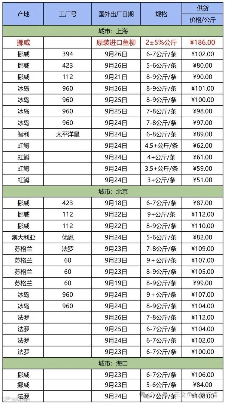 9月29日三文鱼批发行情(上海|北京|海口)