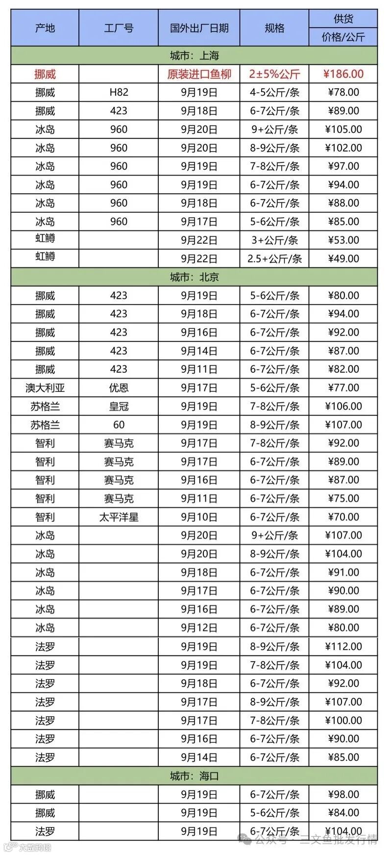 9月25日三文鱼批发行情(上海|北京|海口)