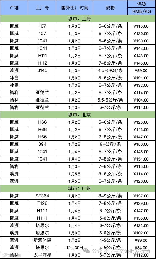 1月9日三文鱼批发行情(北京/上海/广州)