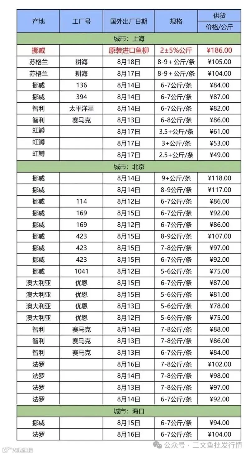 8月21日三文鱼批发行情(上海|北京|海口)