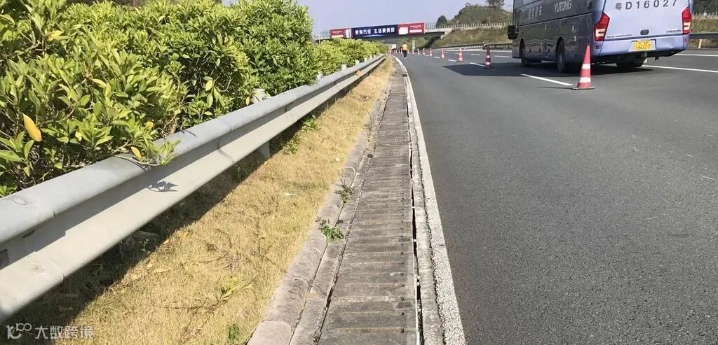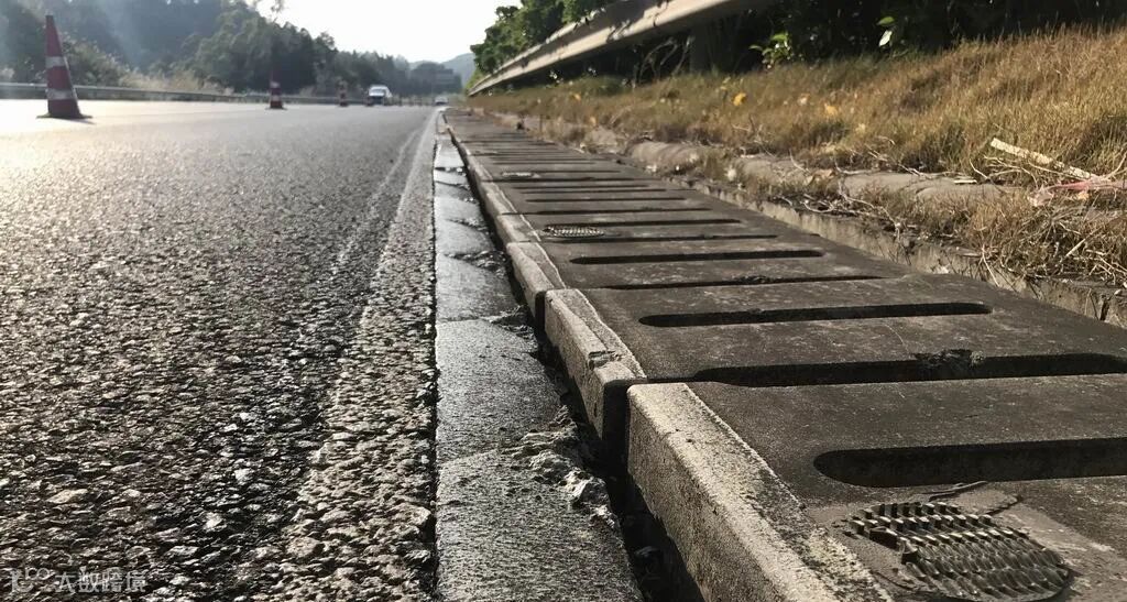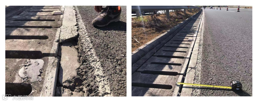 揭博高速公路全线超高路段左侧路缘带宽度为75cm,内侧盖板沟宽度为70cm,行车道边缘线宽度为20cm,超车道边缘线有15cm覆盖在排水沟上,排水沟与路面存在高差及沟缝、沟壁破损、路面啃边等情况。