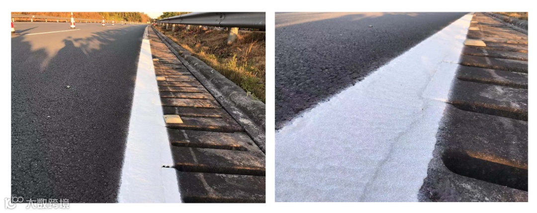 实施标线厚度平均1.0mm左右,能适应现场复杂路况,面撒玻璃珠撒布均匀,粘结牢固;夜间观测效果良好,标线逆反射系数实测平均250 mcd•m-2•lx-1左右。详情如下图: