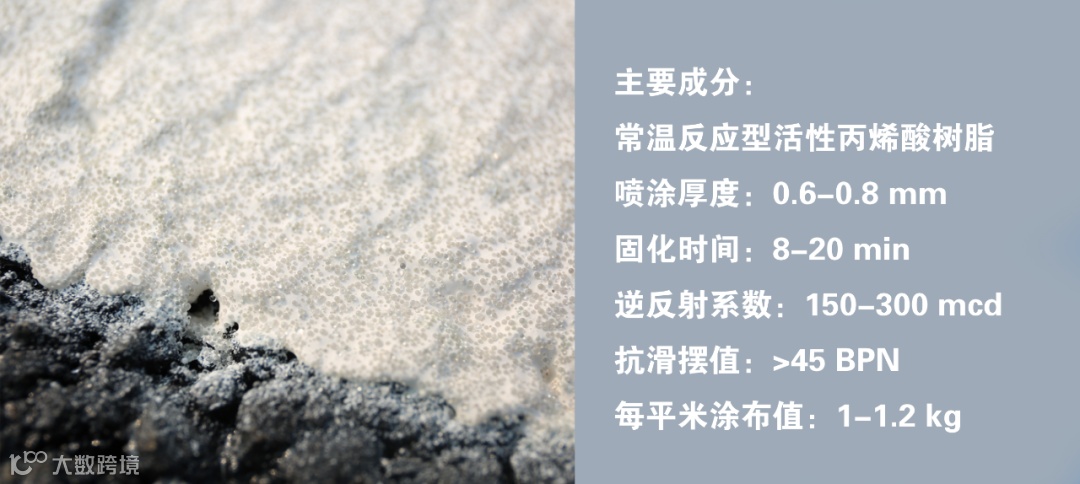 双组份喷涂型道路标线涂料:常温标线涂料,高活性丙烯酸树脂聚合物,能在常温下与基料进行充分的交联反应,形成致密性极高的漆膜,从而与地面、玻璃珠产生良好的吸附力,显著增强标线的附着力与耐磨性。