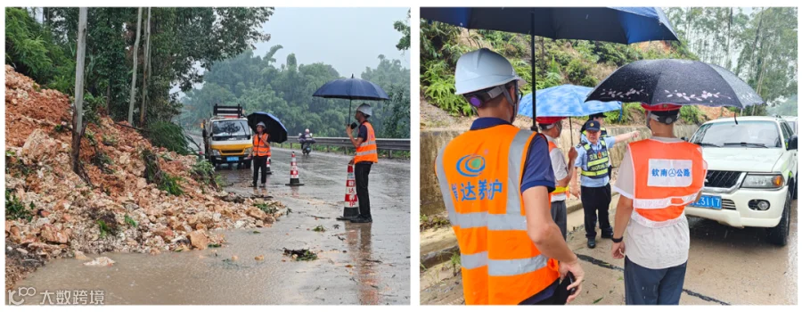 此外,7月21日上午,受台风环流影响,由我司广西分公司钦州国省道养护项目部负责养护的广西国省干线G242、G325、S313等路段多处发生树木倒伏、边坡塌方、边沟堵塞、路面漫水的情况,项目人员紧急启动应急预案,积极协助业主实施交通安全管控,迅速清理路面倒伏树木、边坡土石方、堵塞水沟等,以最快速度抢通全线受阻道路,恢复正常通行。