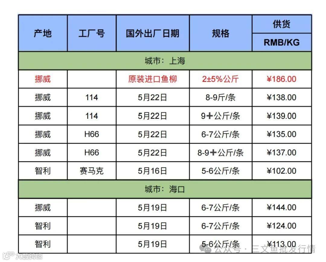 5月25日三文鱼批发行情(上海|海口)