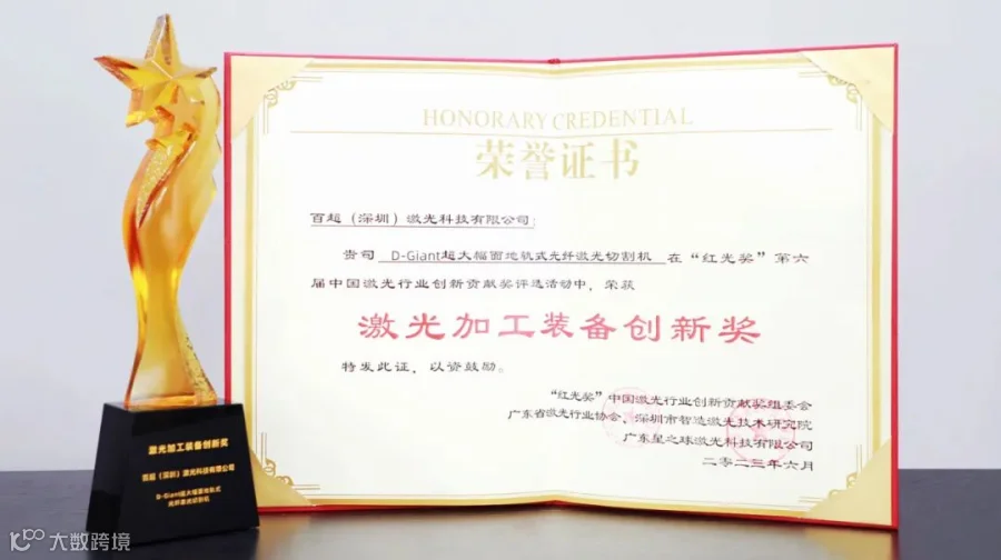 一年一度的激光行业“红光奖”被看作行业的标杆、技术新趋势以及产业的风向标。6月26日,第六届“红光奖”颁奖盛典在深隆重举行,包含“黑科技” 技术、激光加工装备创新、激光科技创新、最佳成长性企业、激光行业影响力企业等13项大奖揭晓,本次共110家业界代表企业,146个项目参选,经过专家审核、网络投票、评委评分三大环节的评选,百超(深圳)D-Giant超大幅面地轨式光纤激光切割机凭借高精度、高速度、高稳定性等特点在众多参评装备中脱颖而出,荣获2023年度激光加工装备创新奖。