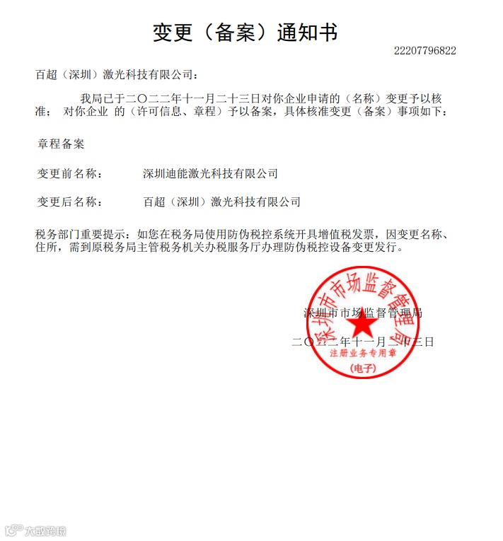 根据瑞士百超集团的战略部署,更全面、更有效地推动各项业务在中国的发展,为客户提供更优质的全球化支持和服务,瑞士百超集团全资子公司——深圳迪能激光科技有限公司,于2022年11月23日经深圳市市场监督管理局核准,公司名称做如下变更: