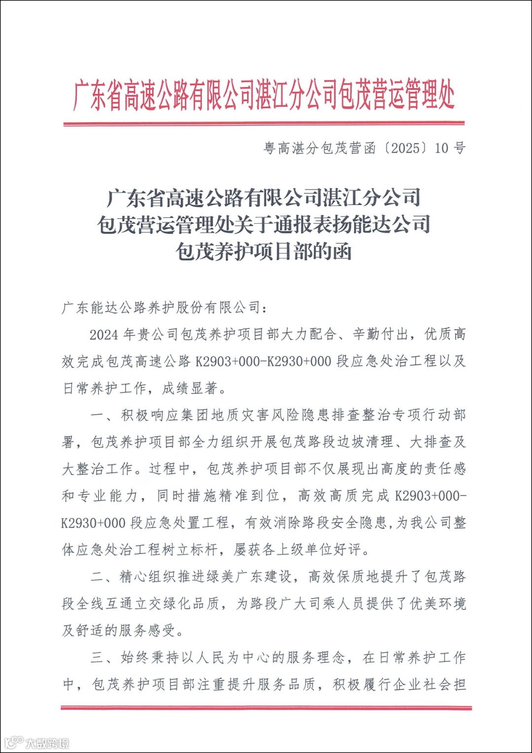 近期,公司包茂、岑罗、清云养护项目部因在各自工作中的出色表现,分别收到了广东省高速公路有限公司湛江分公司包茂营运管理处、广西岑罗高速公路有限责任公司以及广东省南粤交通清云高速公路管理处的表扬文件,凭借专业专注、诚信有为,共同书写着能达公司高速公路养护的荣誉篇章。