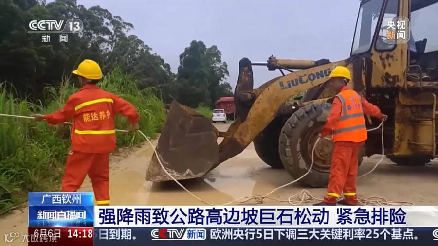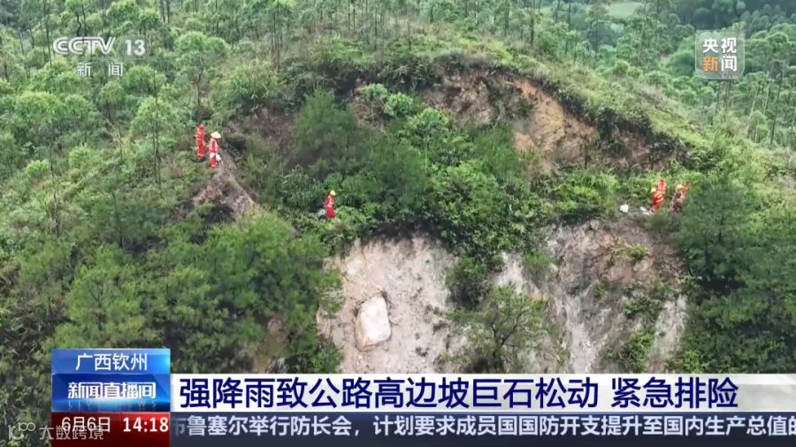 6月5日上午10时左右,受强降雨影响,广西钦州市钦南区黄屋屯镇的省道S312路段K148处高边坡上巨石出现松动,有下滑迹象,对过往车辆的安全构成了威胁。