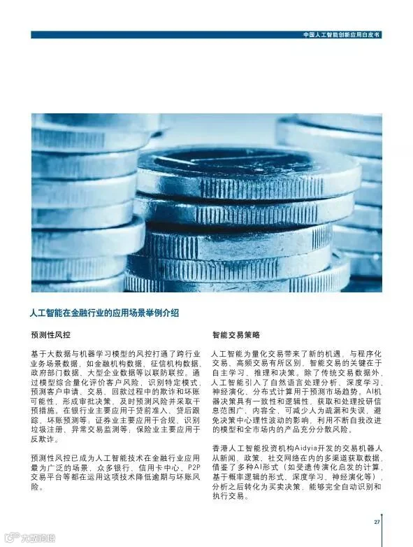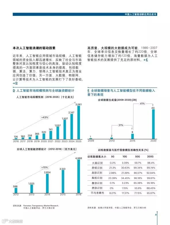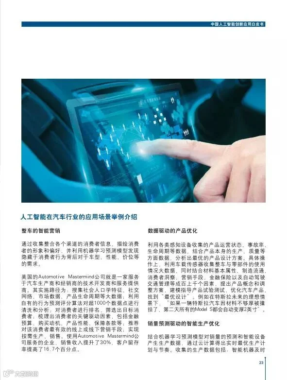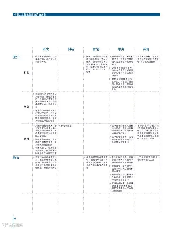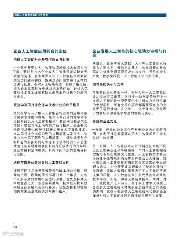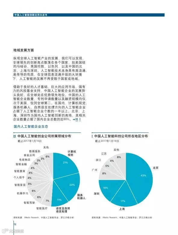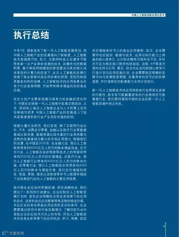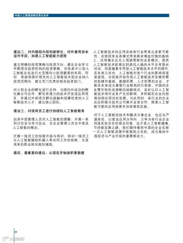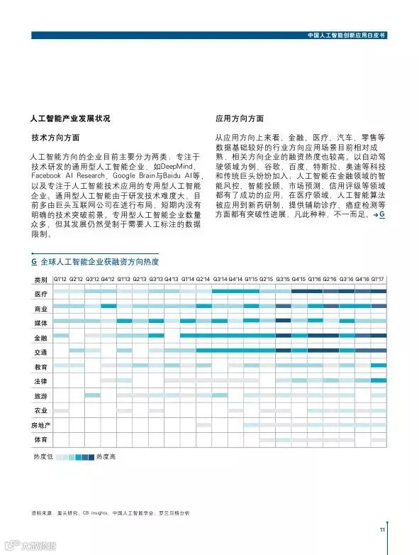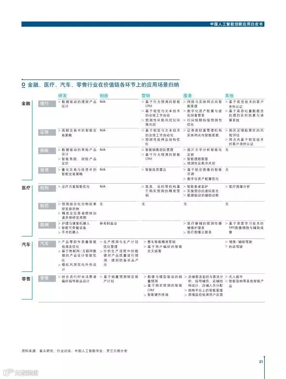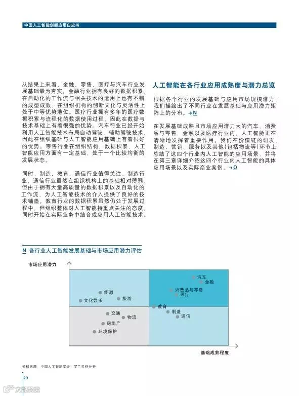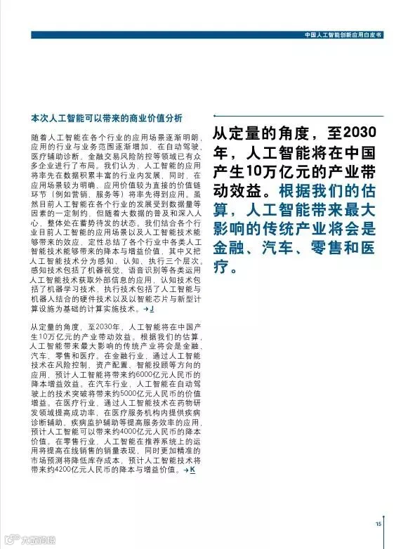 报告指出,中国人工智能企业在当下人工智能第三次浪潮中的发展势头良好,处于全球优势领先地位;金融、汽车、零售和医疗将会是受其影响最大、最具成熟发展基础与市场应用潜力的传统产业,制造、教育、通信行业也值得关注。