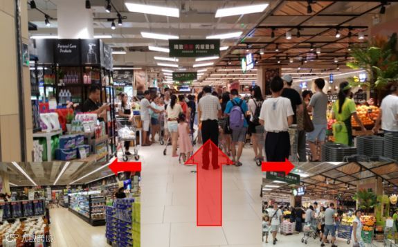 主入口的右边布局新鲜食品左边是洗护用品,顾客的行动上的位置问题,商品的购物属性及购物习惯上的问题,肯定会出现客流的不均衡(右边一直很多客流,左边很难引导客流),必须调整商品布局。