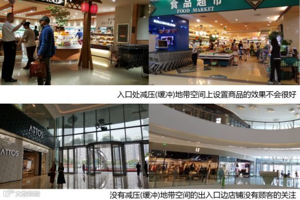 1)在超市的入口前面设置了水果柜台, 顾客大多只是经过,而不是停留挑选商品, 很多顾客会在进入卖场时经过后又折返到入口处挑选水果 。