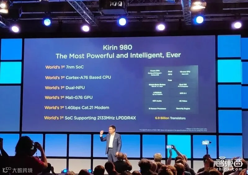 CPU方面,麒麟980也从去年麒麟970的4大核+4小核,升级到了2个超大核+2大核+4小核的全新设计,这三种核的分工不同,小核能够支持音乐、短信这类日常使用,大核能够支持社交软件、图片软件这类应用,超大核则是用来处理对性能要求比较高的游戏等应用。