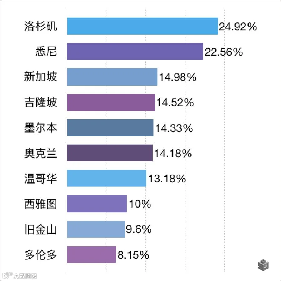 从图3可以看出,洛杉矶成为今年上半年最受海外置业者关注的城市。