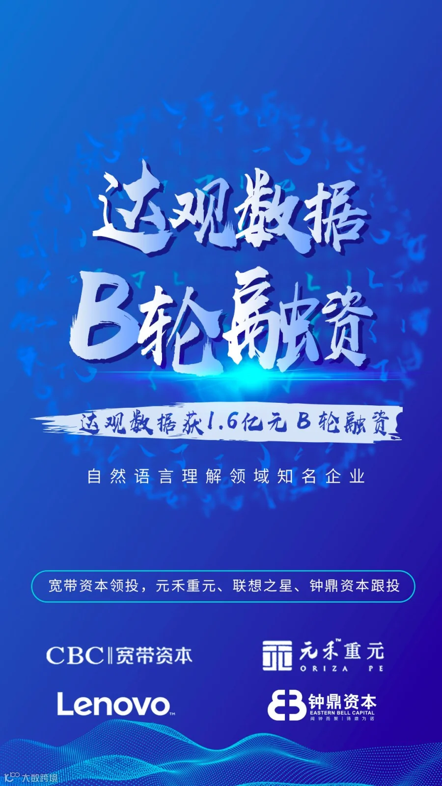 11月22日,达观数据宣布成功完成1.6亿元B轮融资,由宽带旗下基金晨山资本领投,元禾重元、联想之星、钟鼎资本及老股东等跟投,华兴资本担任本轮融资的独家财务顾问。达观数据累计融资额超2亿元,刷新了中国自然语言理解领域的融资记录,成为语义识别领域融资额最高的企业之一。