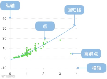 散点图也叫 X-Y 图,它将所有的数据以点的形式展现在直角坐标系上,以显示变量之间的相互影响程度,点的位置由变量的数值决定。